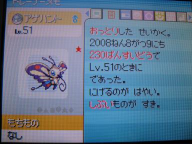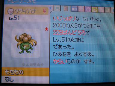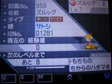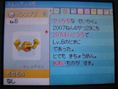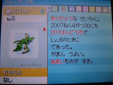 ん?ということはダイヤモンドだけで3匹も色違いと自然遭遇したことになり・・・あ!違った!サファリゾーンで色違いのスコルピにも自然遭遇してるので4匹ですね。(前にも書いたかもしれませんがスコルピには逃げられました。ちなみにソウルシルバーでは、やはりサファリゾーンで色違いのウパーに遭遇・逃げられています。)