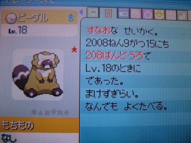 この子もポケトレ産です。確か最初は違うポケモンを狙ってたんですけどなかなか連鎖しなくて、練習も兼ねてとりあえずビーダルで連鎖続けてたらいつの間にか草むらが光っててそのままゲット・・・という感じだったと思います。物欲センサーは本当に存在するのでは・・・?と思い始めた瞬間でした。