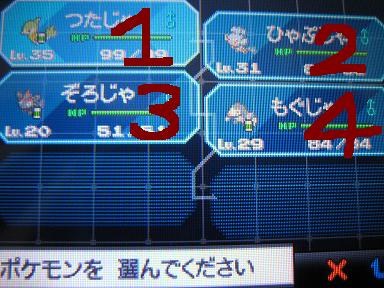 ・ダブルバトルで1のポケモンを4に、2のポケモンをゾロア(3)に同時に交代すると、ゾロアは1のポケモンにイリュージョンする(上の画像参照)