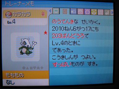 余談ですが、ポケモンに触れ始めたばかりのころ何故かカラカラの名前をプリンだと勘違いしていて、全然プリンて感じじゃないなと思ってました(そりゃそうじゃ)。ポケモンキッズが原因だったような気がするんですが詳しく思い出せない・・・
