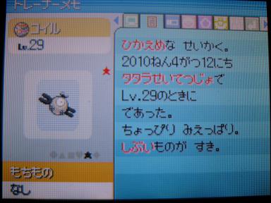 今回はコイルということで、無謀にも磁力+控えめ+高威力めざパ氷・地面・炎・草を狙ってみたんですけど・・・やっぱりそう簡単にはいかないですね。全滅でした^^;